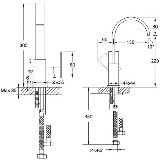 Flexibele slangen en de bevestigingsset wordt meegeleverd