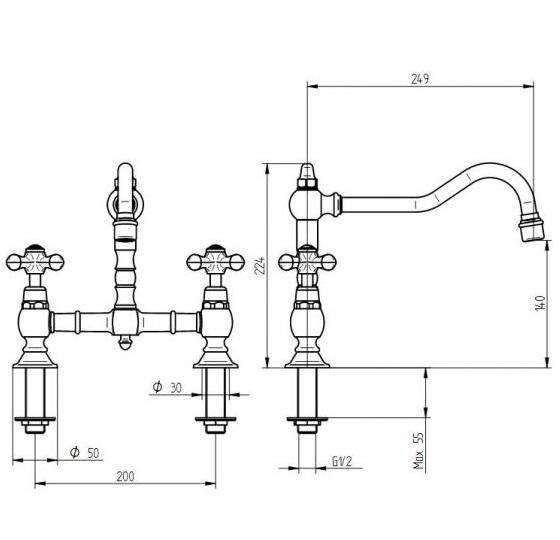 Deze Klassieke keuken brugkraan heeft een hart om hart afstand van 20cm.