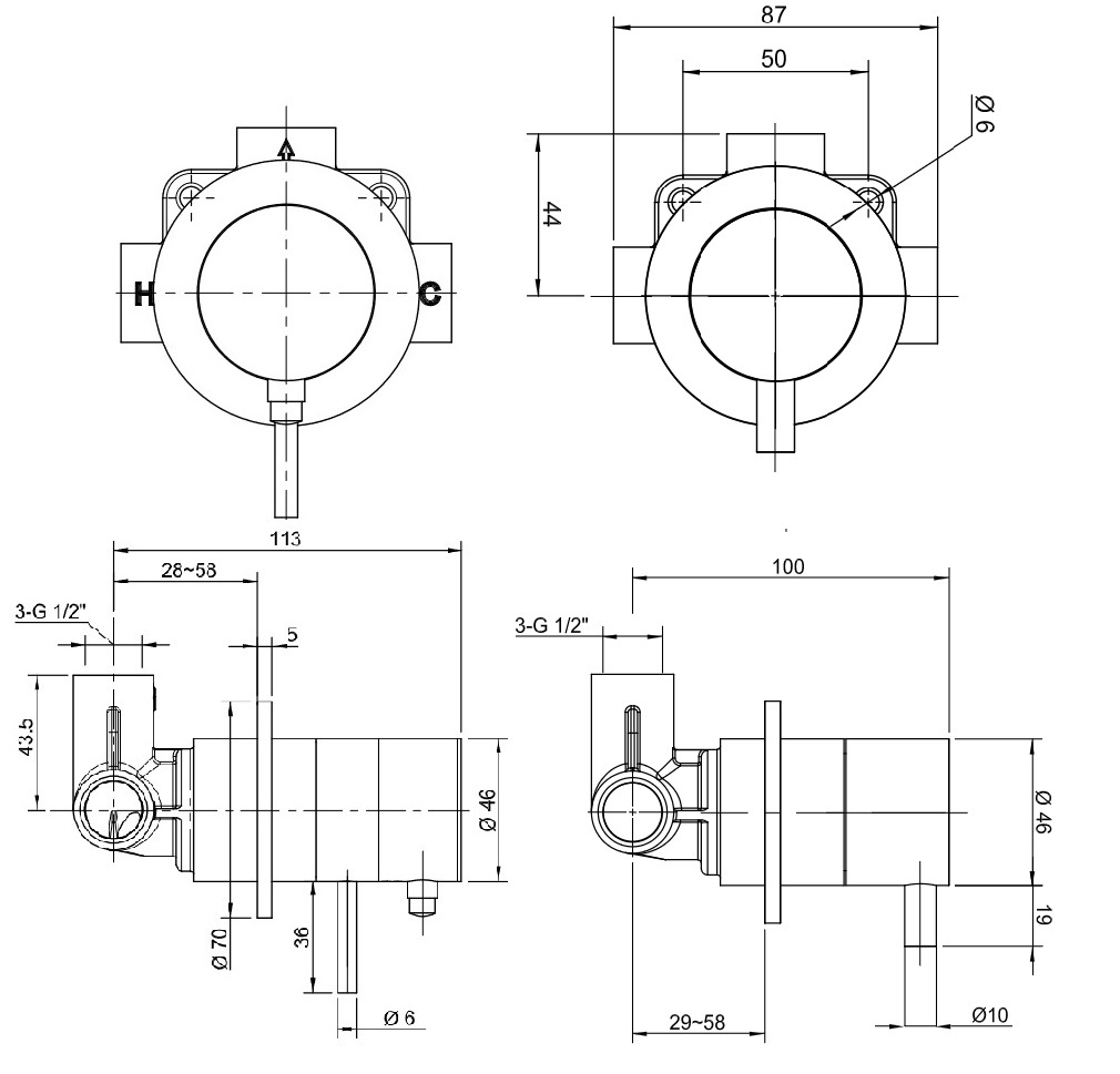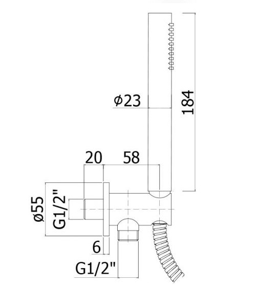 plafond uitloop of wanduitloop, een staaf handdouche, handdouchehouder met watertoevoer en doucheslang.